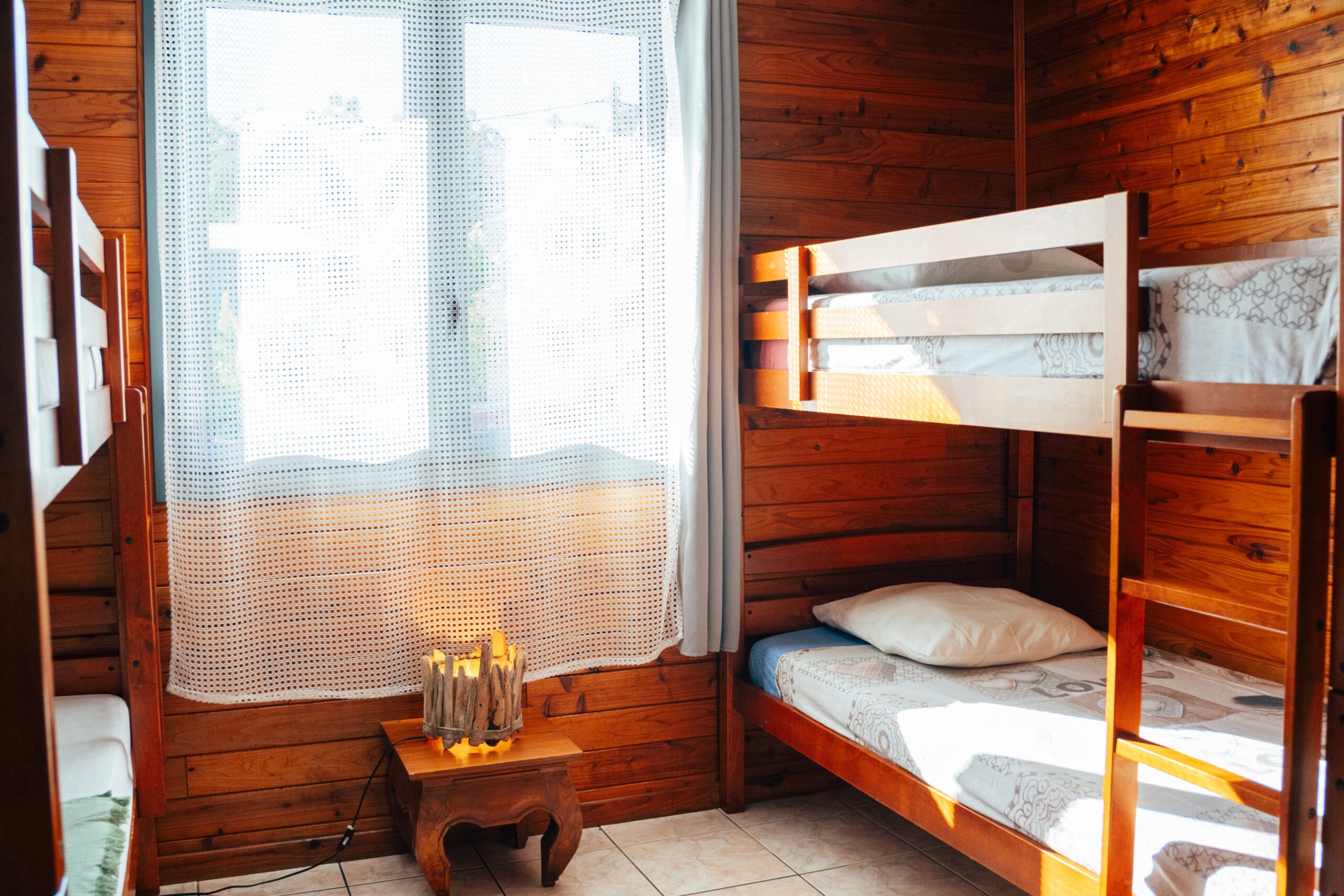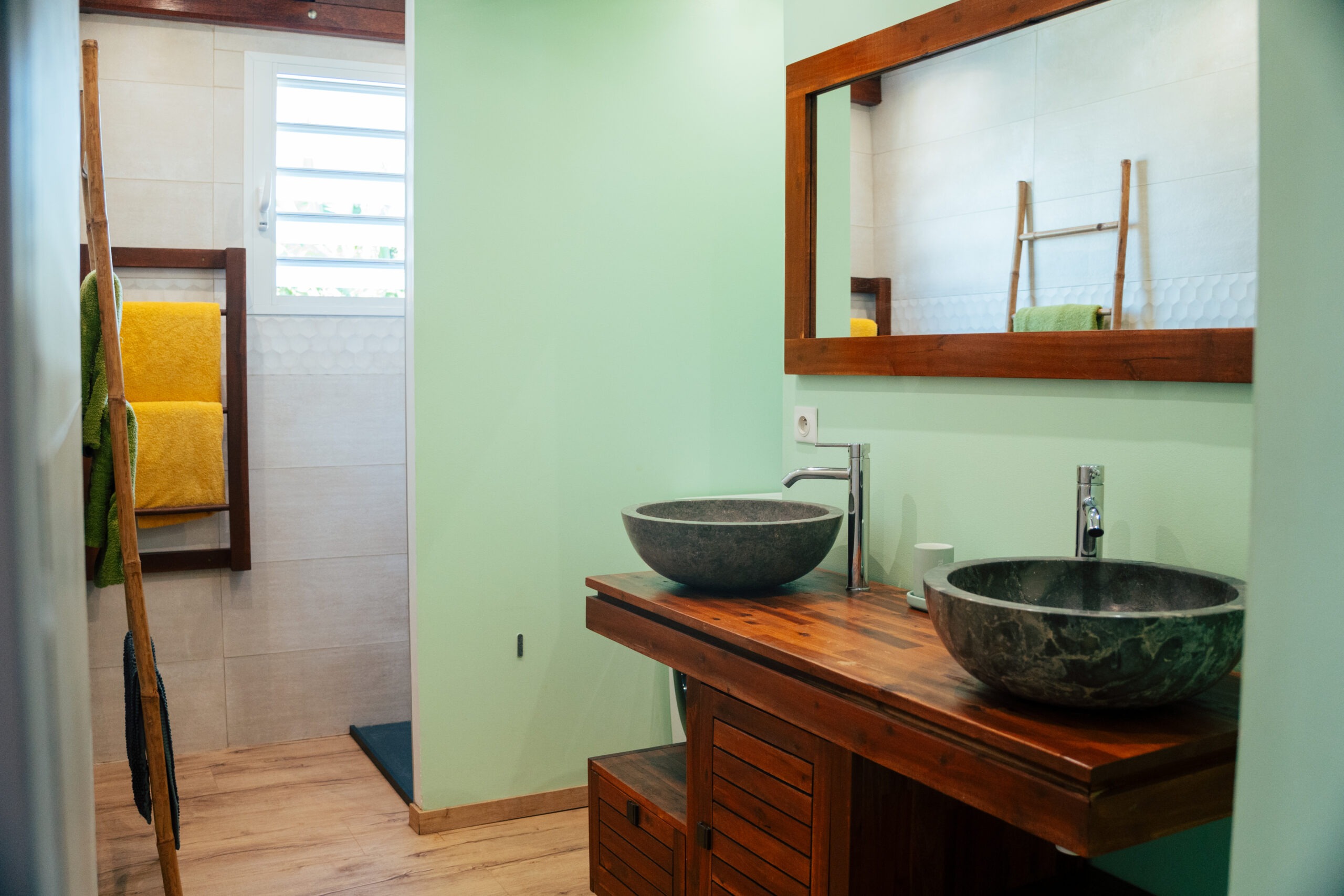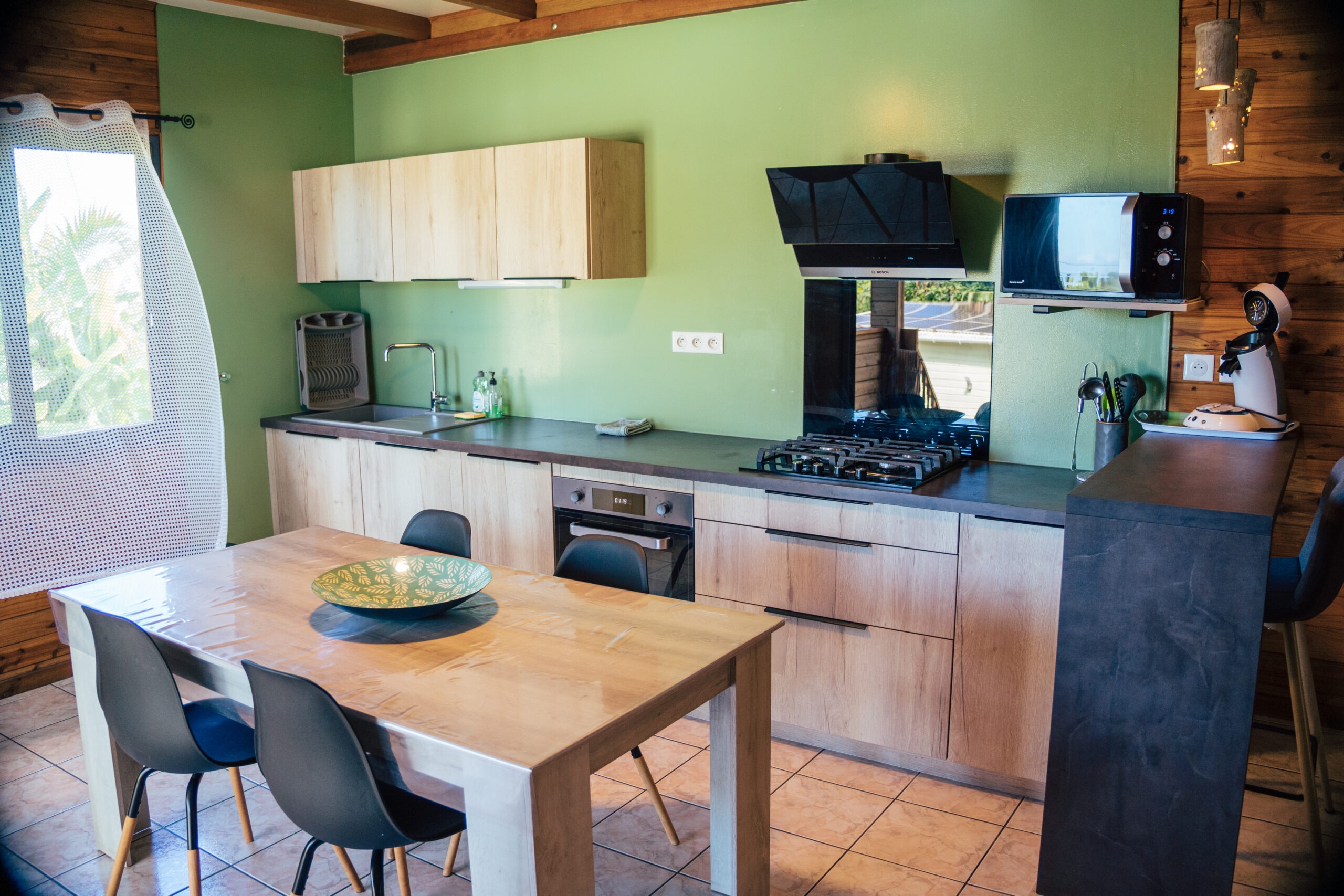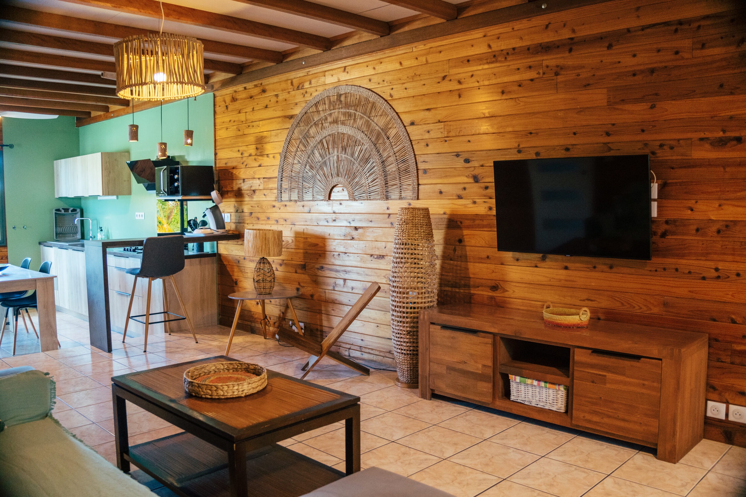 La Ti Kaz de 80 m2 peut accueillir jusqu’à 6 personnes, se compose de 2 chambres à grands lits, 1 coin couchage avec lits superposés, 1 salle de bain avec douche à l’italienne, 1 WC, 1 cuisine aménagée entièrement équipée (lave vaisselle), salon séjour, d’une grande terrasse privative ainsi que d’une place de parking privative.